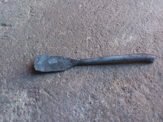 Pequeño cuchillo forjado en acero 5160 procedente de ballesta de camión, con mango del mismo material torsionado.
